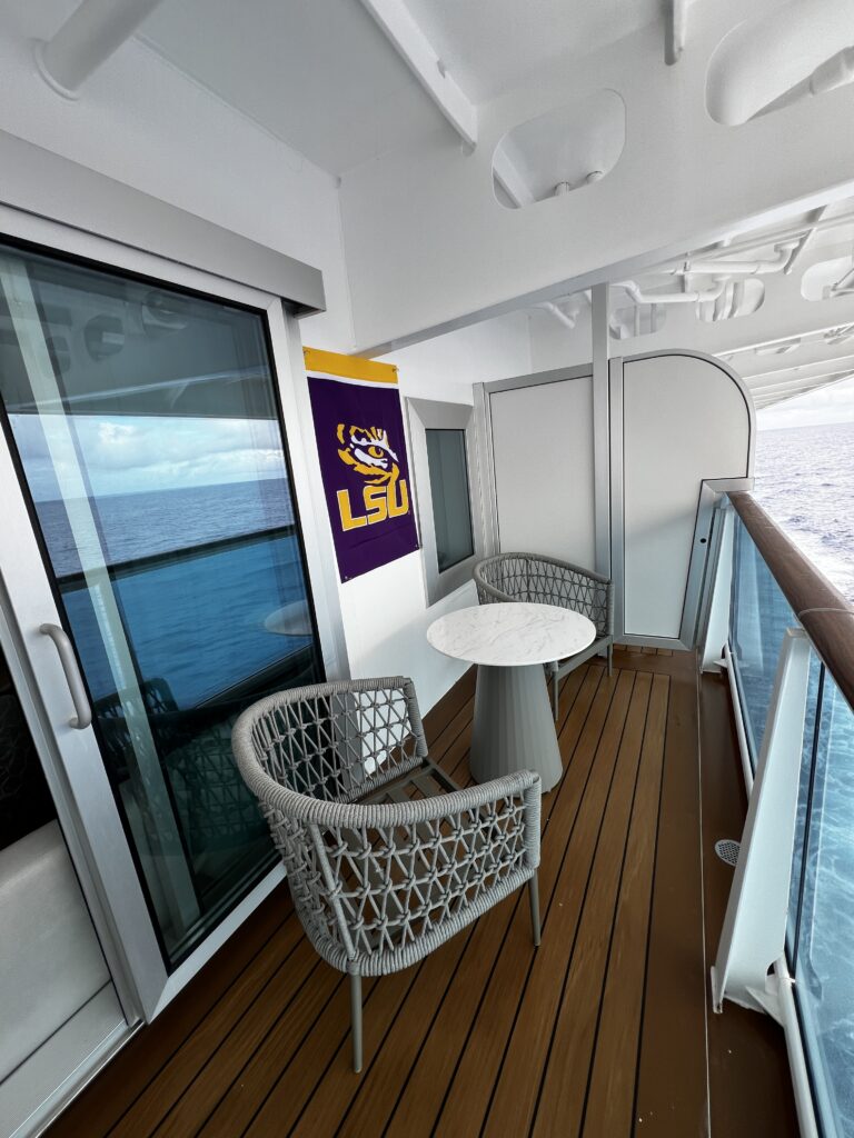 The outside balcony with the LSU flag on the wall held there with magnets. I wanted to bring a larger banner and hang on the balcony railing but figured it would be removed and I was not sure how I could hang it. Now that I see the ceiling I know for the next time I can hang a larger banner on the balcony. The balcony is a good size, but the chairs do not make lounge chairs which is a bummer. The covering will protect us from both sun and rain as it extends out far. The chair cushions are thick and inside the cabin for these photos.