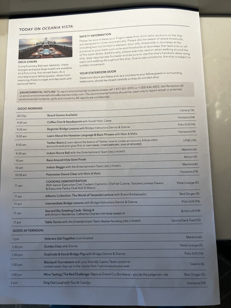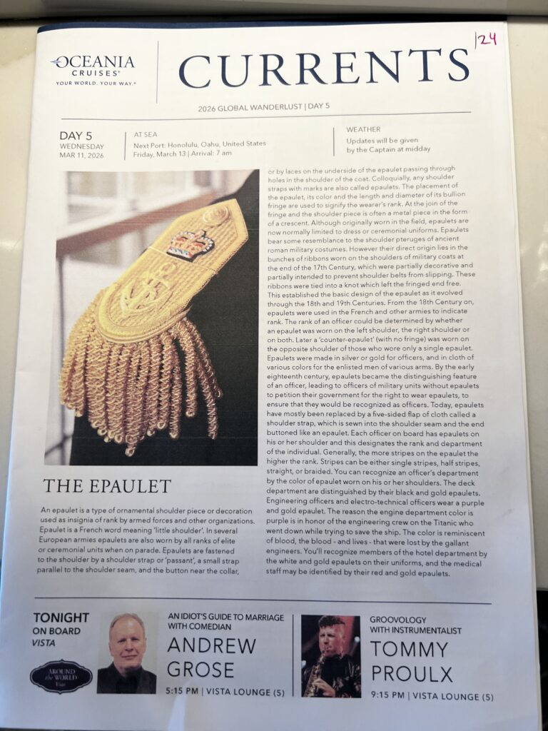 This afternoon we attended the third in a series about Hawaii. The presentation was called A Brief History of Hawaii. Just like the previous presentations in this series, it was outstanding. Tomorrow I told Jackie I am going at 2pm for the 3pm presentation which will cover Hawaii in WWII. I am sure the Vista Lounge will be at full capacity. Jackie went to her second Digital Learning Class this afternoon Photo Editing for Social Media. She said the classes while basic as the titles suggest, she is learning new things and enjoys the classes. We wanted to attend the comedian show at 5:15pm this evening, but when we arrived at 5:00pm there was not a vacant seat in the Vista Lounge. I guess we should have attended the show a couple of nights ago, but our old asses cannot hang at 9:15pm….laughing.