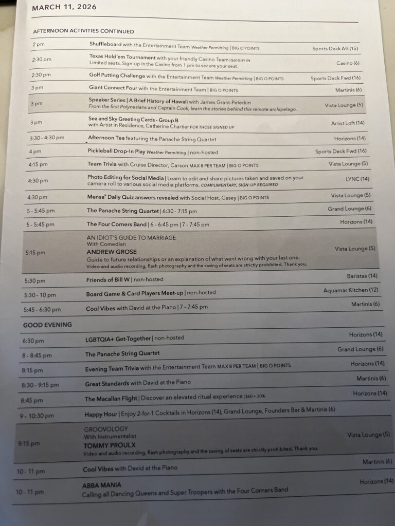 Wednesday March 11th is our 5th day aboard The Vista. We had today and tomorrow at sea before reaching Honolulu on Friday. Unfortunately, the forecast calls for rain on Friday (think it is 90% chance), but we will deal with it on Friday.