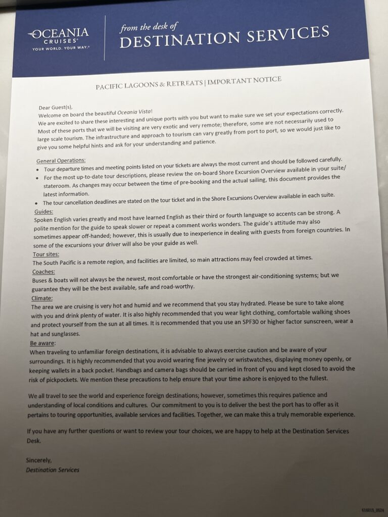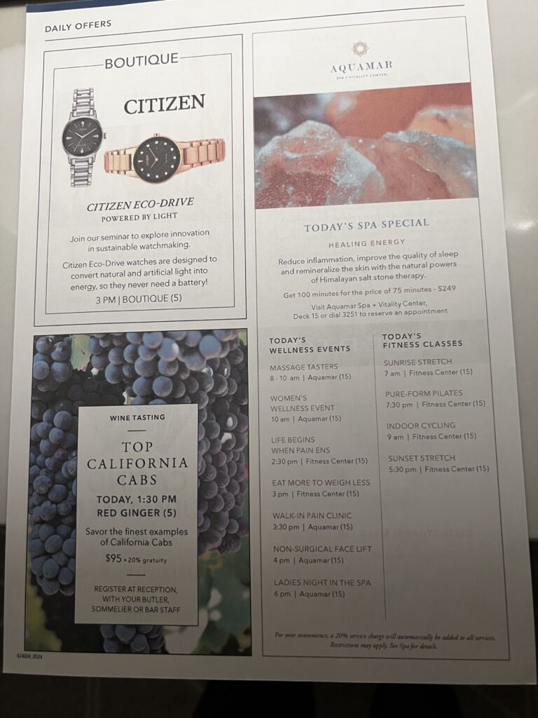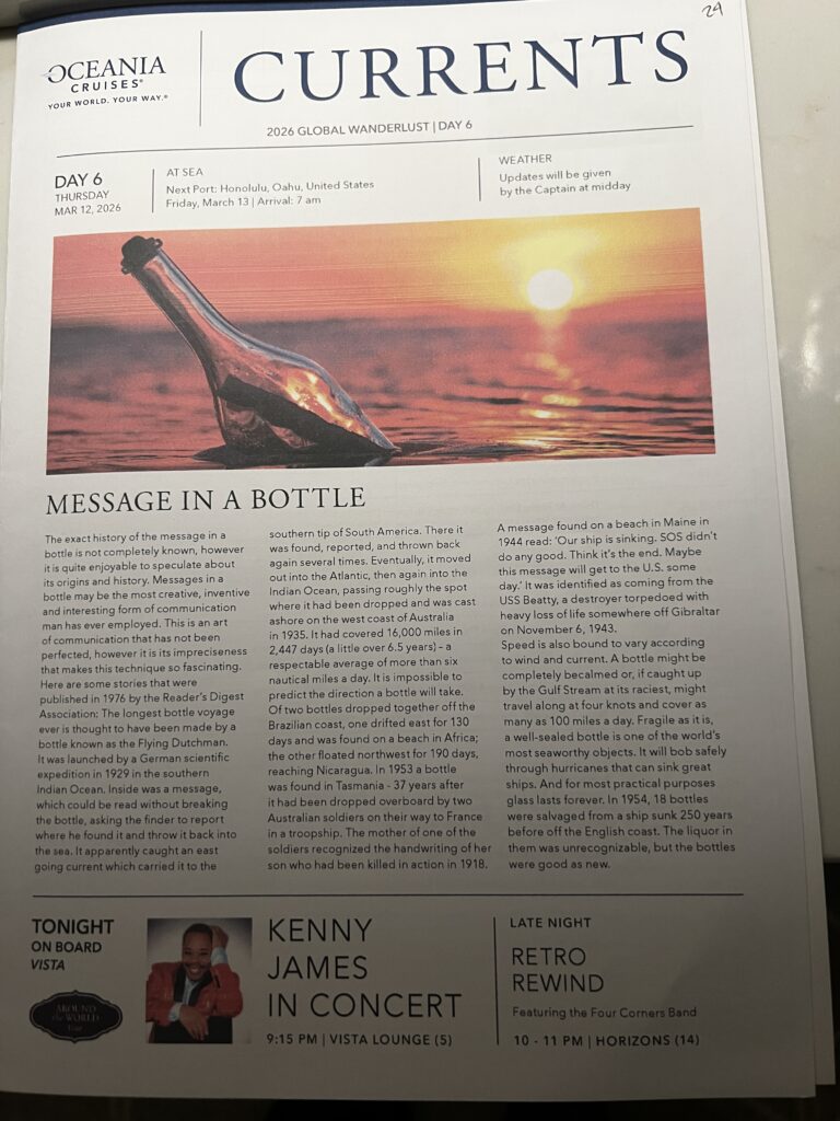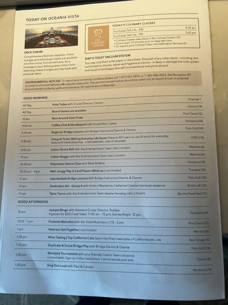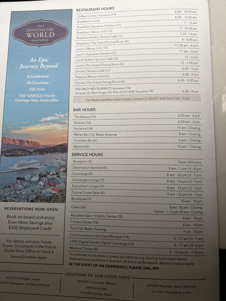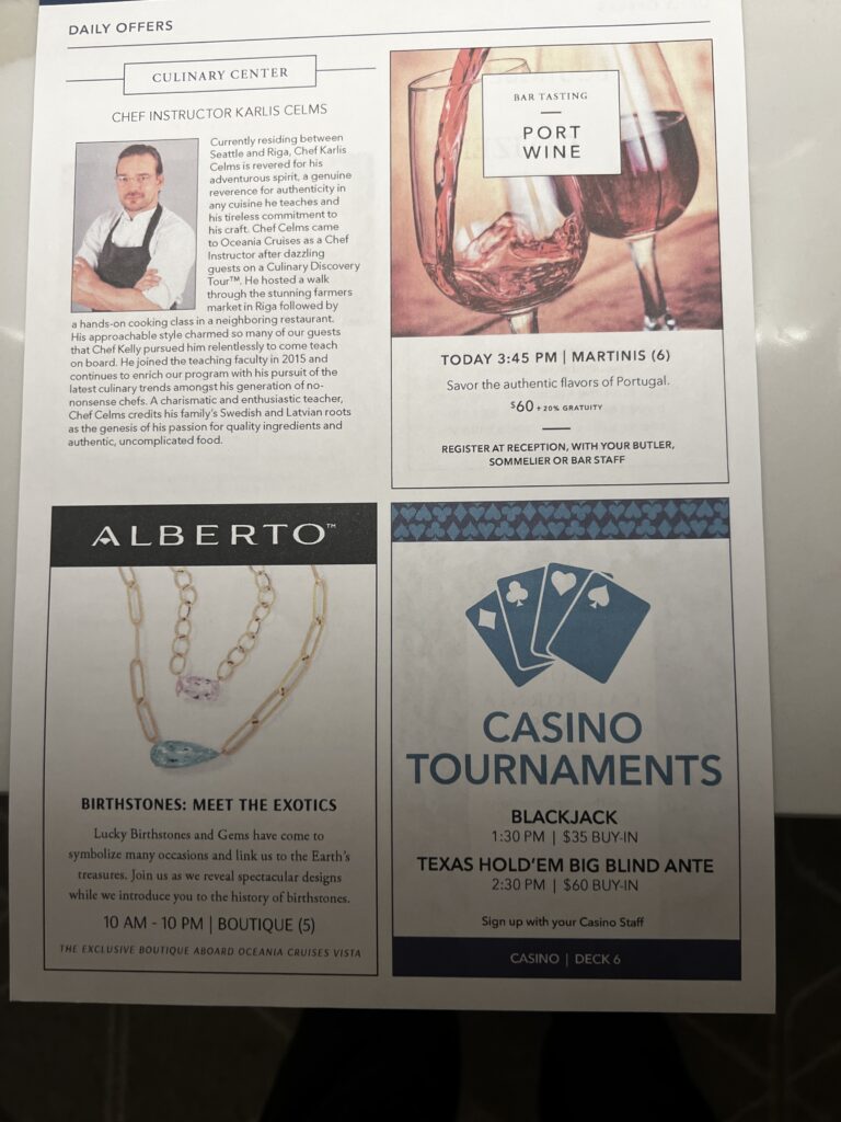 Copy of The Daily Currents. The Currents is usually four pages with a front and back inserted with advertising for the spa, jewelry store and casino. Thank you Baby Jesus Oceania does not have an art gallery or photographers on the ship. I am a bit disappointed no craps table in the casino, but that should save me a few dollars. The Currents provides a daily schedule of events and on the fourth page the restaurant and bar hours, along with service hours for different areas of the ship.
