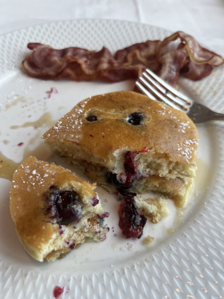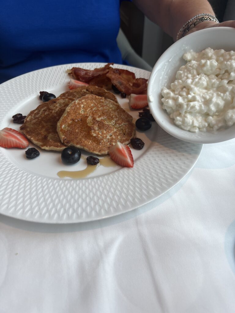 Decided on the dining room for breakfast this morning. Not sure what happened, but the menu photo disappeared. I will take it again on our next visit to the dining room for breakfast. Jackie had banana pancakes and I had blueberry pancakes. She also asked if there was cottage cheese on the ship and she was brought a bowl of cottage cheese. The next question will be is there grits on the ship.