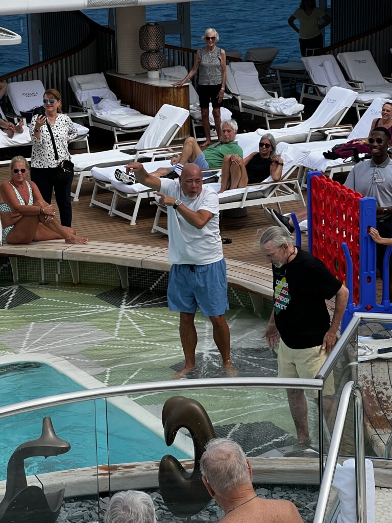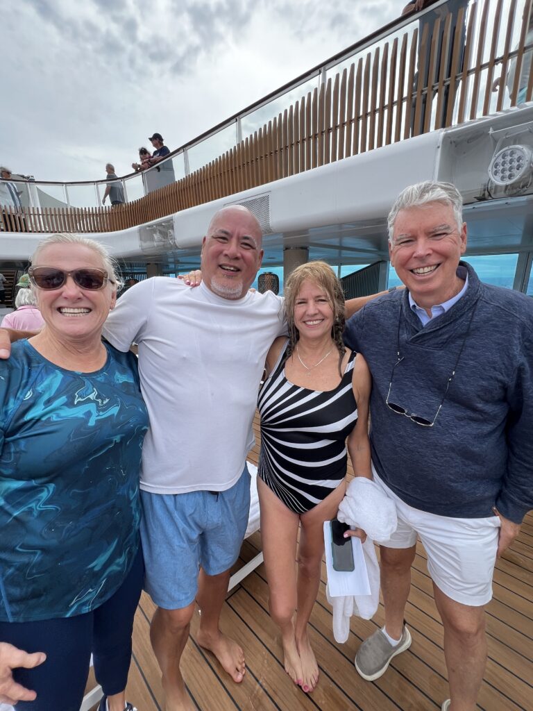 After breakfast we went to the pool deck to cheer for a couple we have met on the ship David and Marta as they are finalist in the ship’s Amazing Race. David and Marta are from Dunedin, Florida. They ended up winning the championship with the last contest involving the swimming pool. Below are their pictures along with John and Joan, a couple from New Orleans (Slidell) that they have made friends with while on the ship. In the photo David and Marta are in the middle.