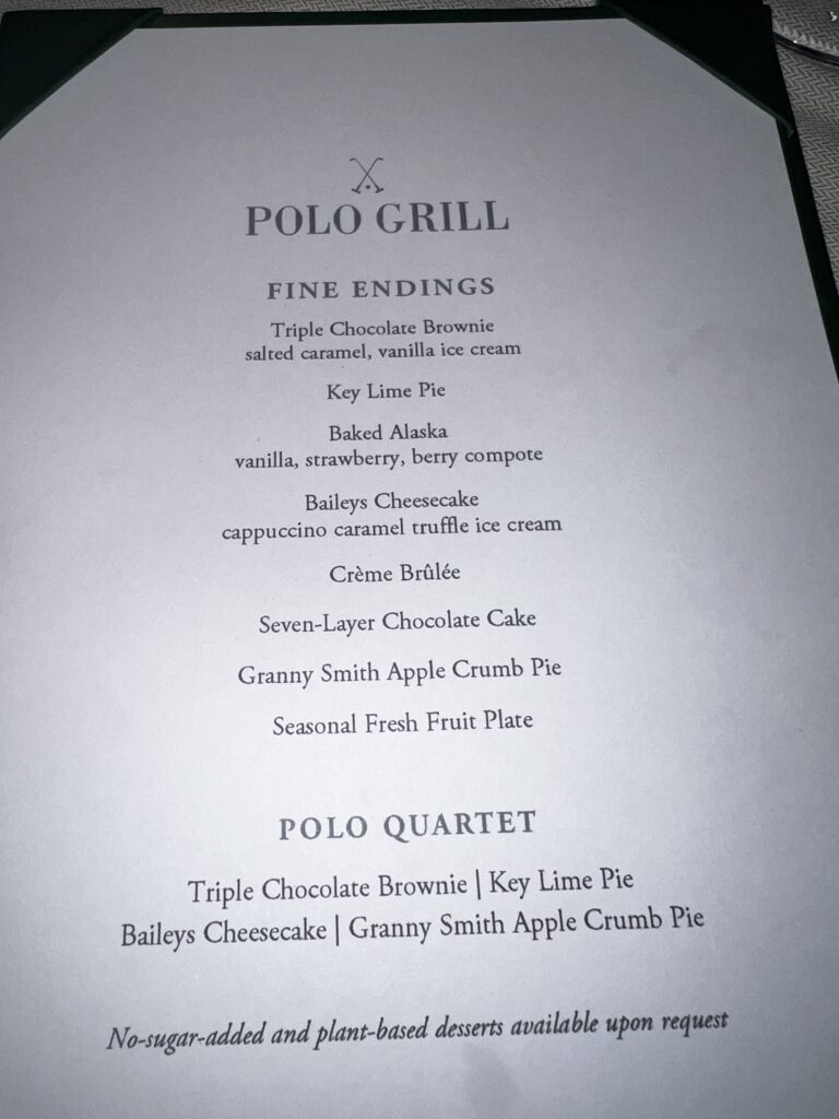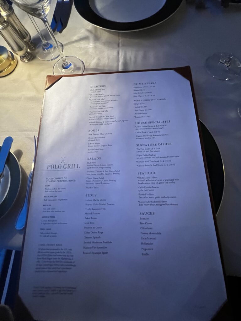 Dinner tonight was in The Polo Grill. It is the name for Oceania’s steakhouse. Just amazing food and service.