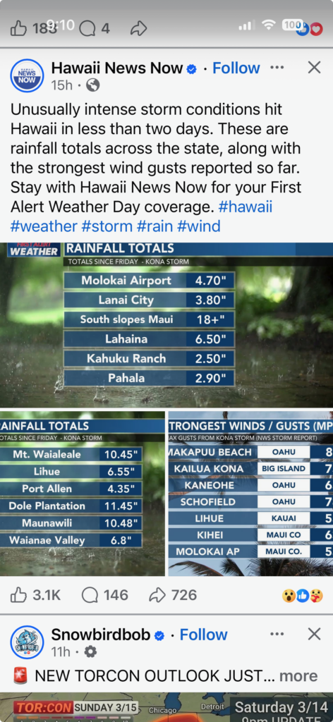 Day 8 Saturday March 14th was a slow photo day. Sadly, our port of Kona was cancelled due to the terrible weather hitting the Hawaiian Islands. Below are a couple of text messages my sister Stacy sent me showing the amount of rain and wind over the last 48 hours in Hawaii. Jackie showed me photos of Maui and the terrible pictures of flooding of homes, streets and businesses.