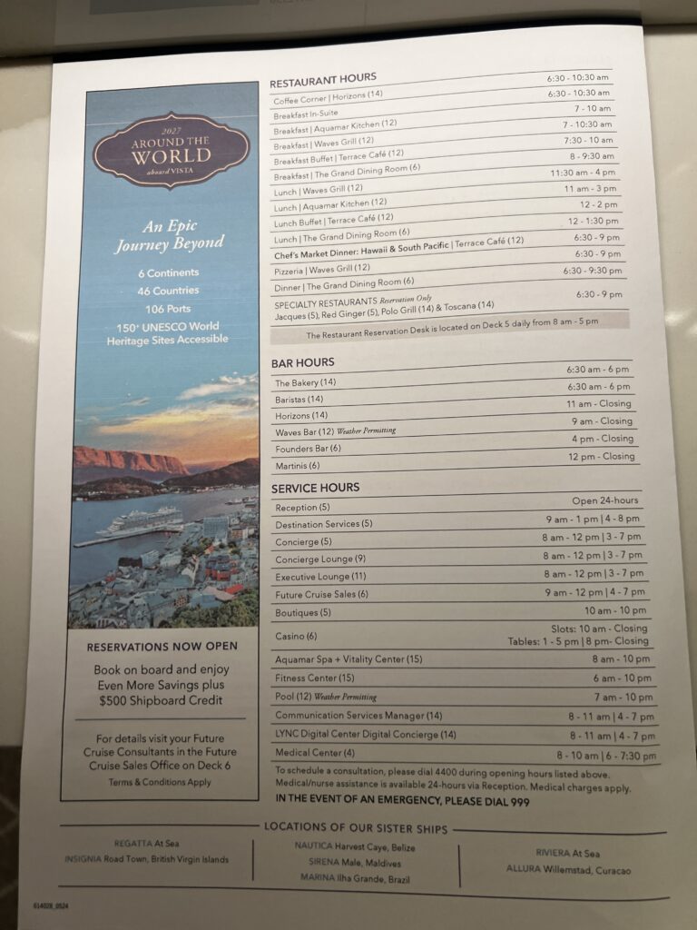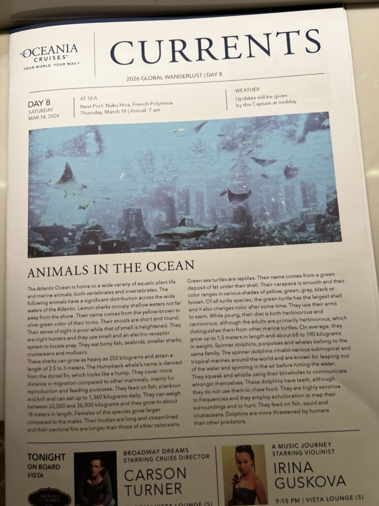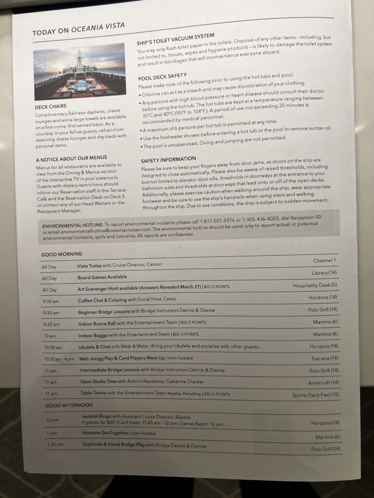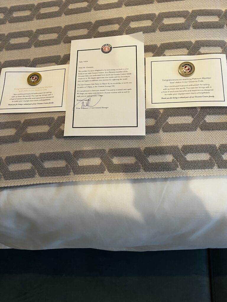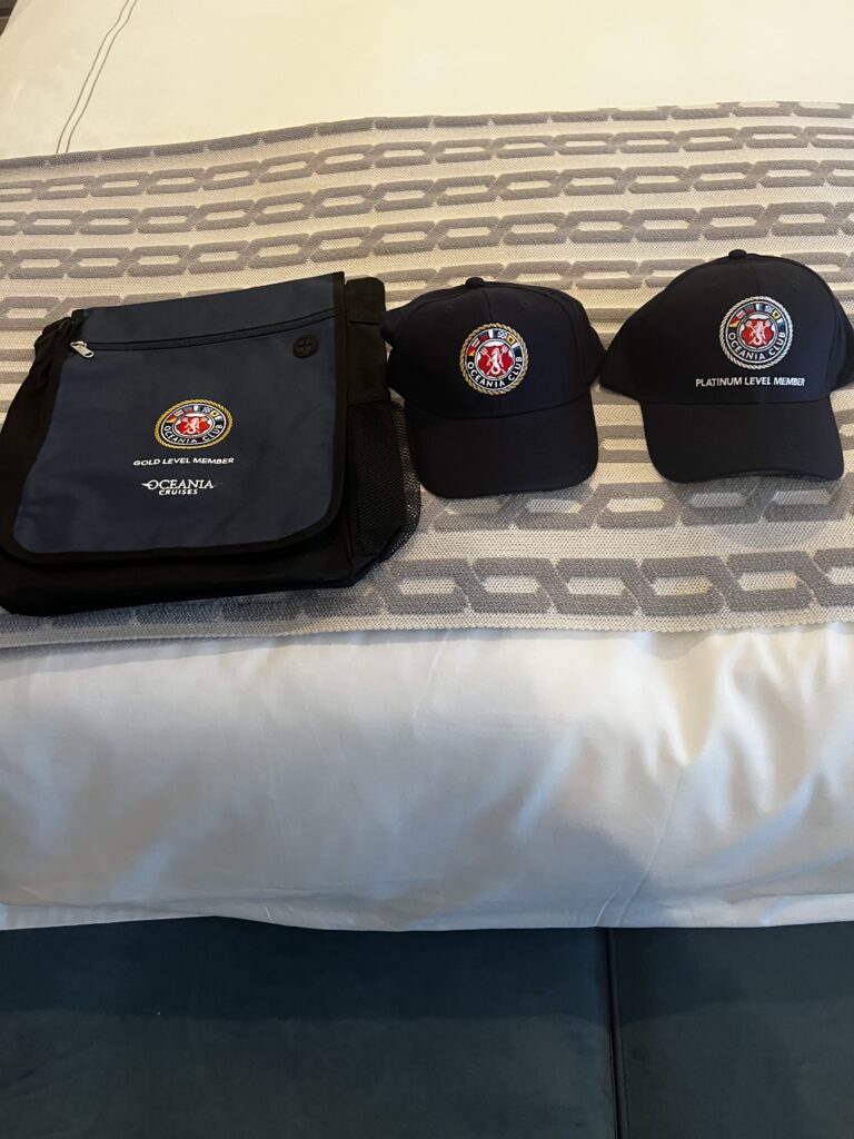 Our original cabin steward has left the ship to return home and we have a new steward. Her name is Ivana. You know I have to give her a hard time her first night. I told her hey the other cabin steward gave me a present every night and Ivana’s first night I didn’t get a present. So, last night when we got back to the cabin we had these two items waiting for us. We each received a cap, but under Jackie’s cap was a blue tote bag. I didn’t get one so that is good to give me something to give her grief about…laughing. Also, we received pins for achieving new levels in Oceania’s Captain Club. I think there is a party on March 16th and we are supposed to wear our new pins. At this rate, we will need a new suitcase to carry our haul back home in July.