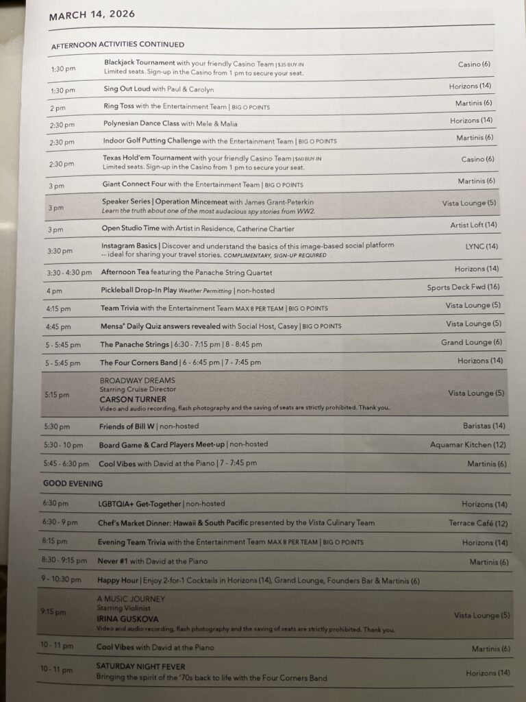 After lunch I met David Chen in the Cigar Lounge before going to the 3pm Speaker Series presentation by James Grant-Peterkin on Operation Mincemeat. I am addicted to this guy’s daily (at sea) presentations. This talk was about a spy story that happened in WWII that possibly played a big part in the success of the Normandy landings.