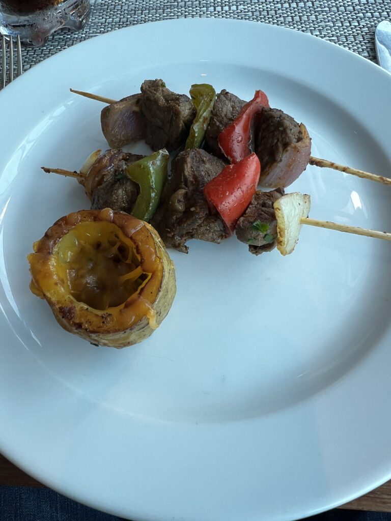 I hit the special grill meal again today — beef kabobs and a potato stuffed with cheese and sort of like taco beef.