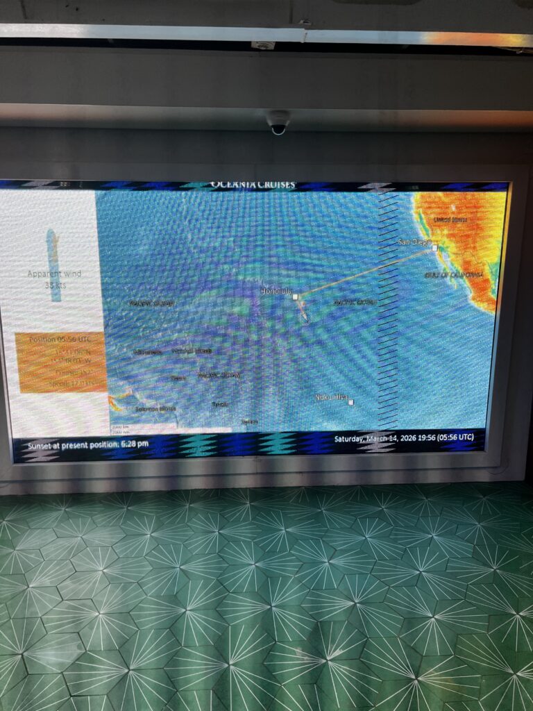 Photo of the digital map on the pool deck showing the ship’s located last night