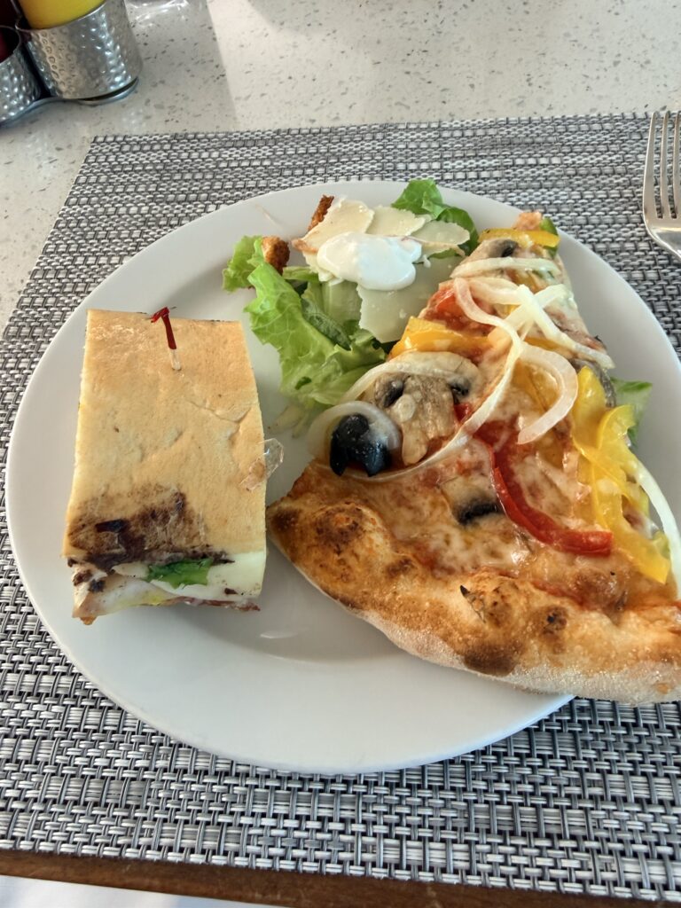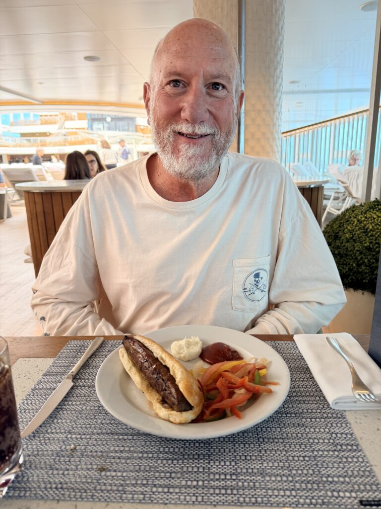 We met up again and headed for the cafeteria……I always call it the cafeteria….hold on let me check on the proper name. The Terrace Cafe is what it is called but when you from Golden Meadow and now Cut Off, it is called the cafeteria. On the way there we met up with Stephen Deboo and his wife Lorna. They are originally from the UK but have been living in Portugal for the past 24 years. Stephen and I have communicated before coming on the ship as he also has a blog. His is only about 20 levels above where mine is. Sadly for him, the internet on the ship is killing him as he does a great job with videos, but it is impossible to post a video while the ship is at sea. I encourage you to view his blog page when you get a chance. The URL is World Cruise Blog 2026 – Our Around the World Cruise Blog. After speaking to Stephen and Lorna we headed to The Terrace Cafe and passed through the Waves Grill. I mentioned either yesterday or the day before they normally cook or mostly grill something different every day. So, we pass through and I found heaven on the ship……sausage po’boys!!!! In Jackie’s afternoon class she used me as her guinea pig when she created a short featuring me and my po’boy. Jackie went to the cafeteria and returned with her lunch which included a muffaletta sandwich (not quite Louisiana quality) and a slice of vegetarian pizza.