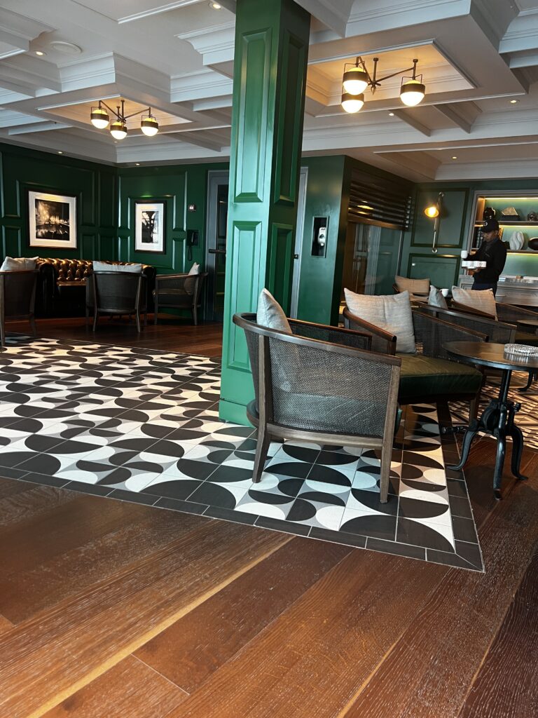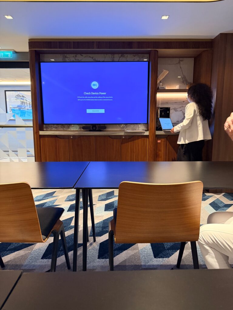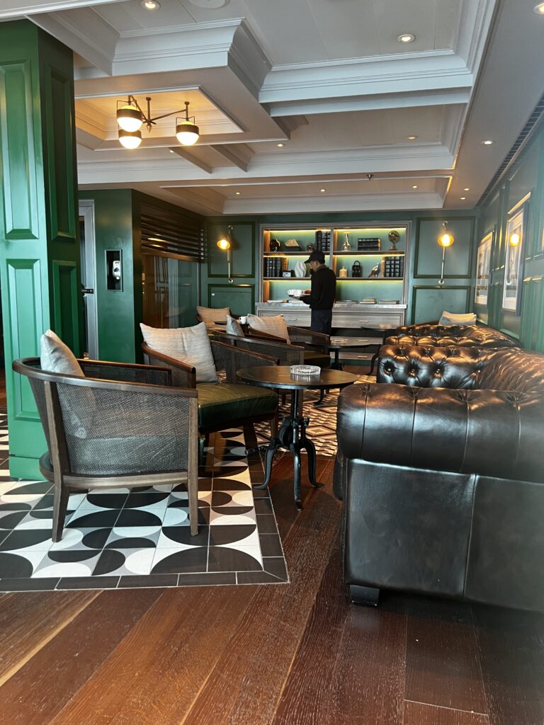 Jackie then went to an IT class Social Media Basics and I went to the cigar lounge to read emails and view the video that Kelsi had sent me explaining what had gone wrong with the blog and how to fix it if I click the wrong places again. I should have told him not to put any buttons on the screen if I am not supposed to touch them. 🙂 The Lync Digital Center is great as there are employees available at a couple different times during the day to help you with issues you might be having with the internet. Unfortunately, they cannot do anything about the slowness of the internet on the ship. It is a complaint you hear from many passengers. Below are photos of the Lync Digital Center classroom and the cigar lounge. I am thinking we need an addition to the house and not for an IT Digital Center….laughing.