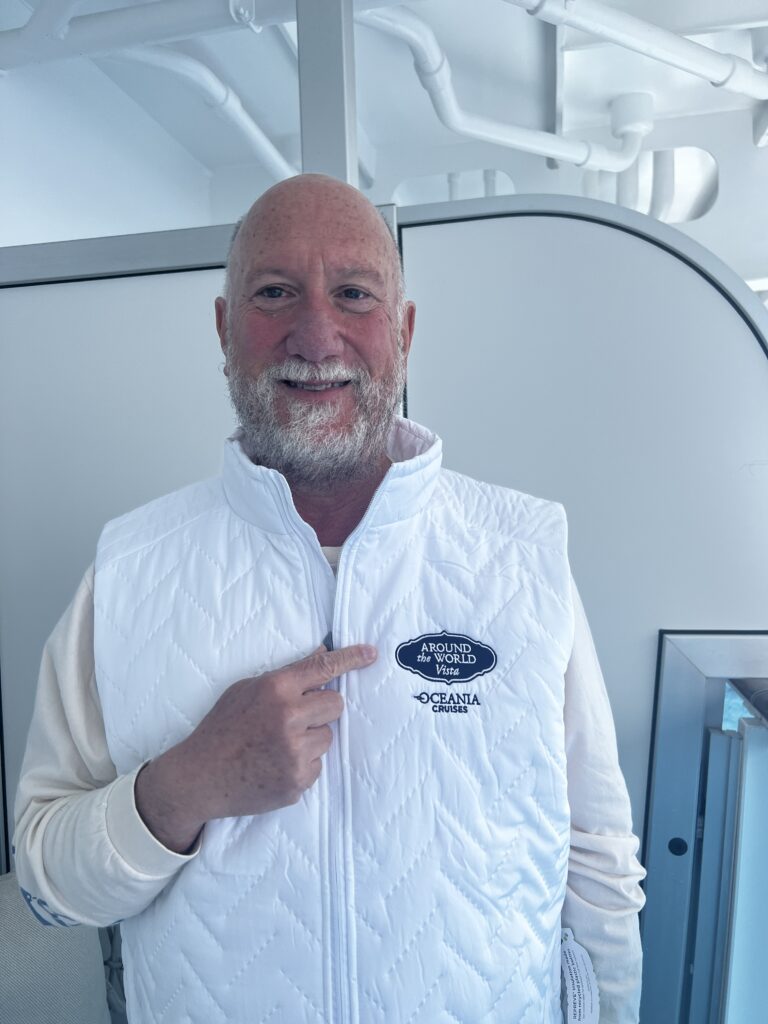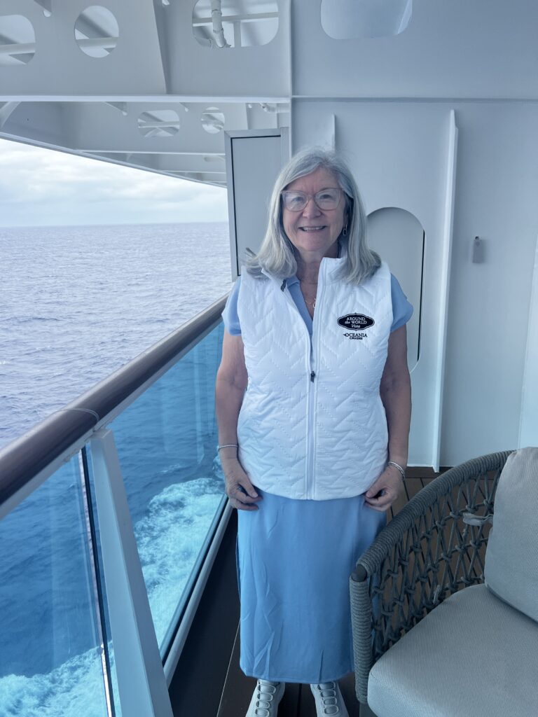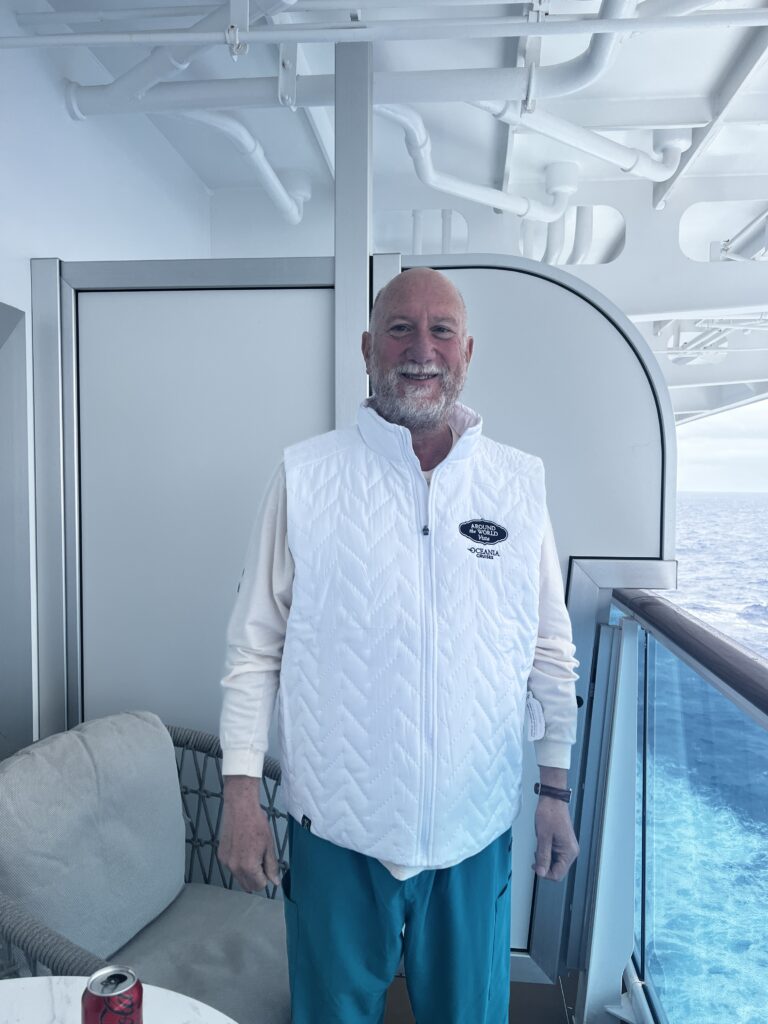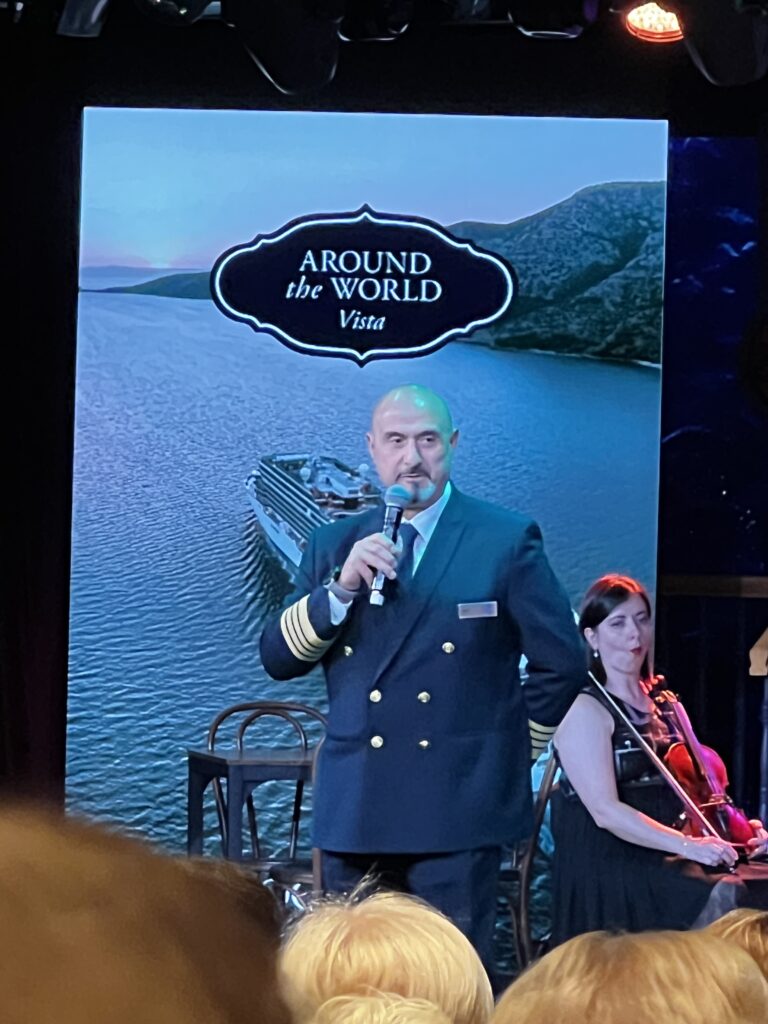 After Jackie returned from her class to the cabin, it was time to quickly get ready for a cocktail party held for the passengers doing the entire World Cruise. Currently, there are 1081 passengers on the ship. 540 passengers are doing The World Cruise either starting in Los Angeles in December, Miami in January or San Diego in March like we did and all finishing in Miami July 6th. Of the 1081 passengers the three largest numbers of nationalities are Americans, Canada and the UK. This current segment ends in Papeete, Tahiti. The captain and cruise director spoke to The World Cruisers and each officer introduced themselves to the group. It was a good time. The captain is Luca Manzi which is almost like The Godfather’s Luca Brasi but the ship captain is not as big. Scary thought we get another bottle of wine or Prosecco when the new segment starts in Papeete.