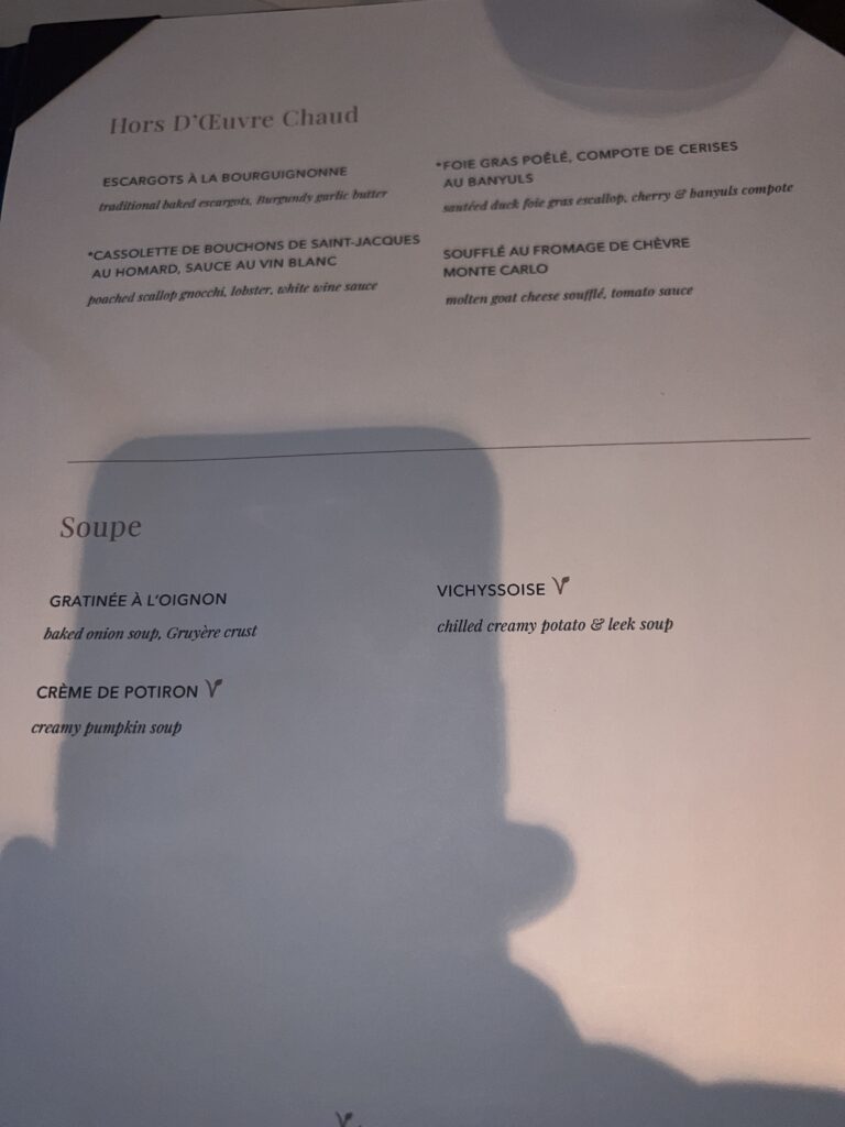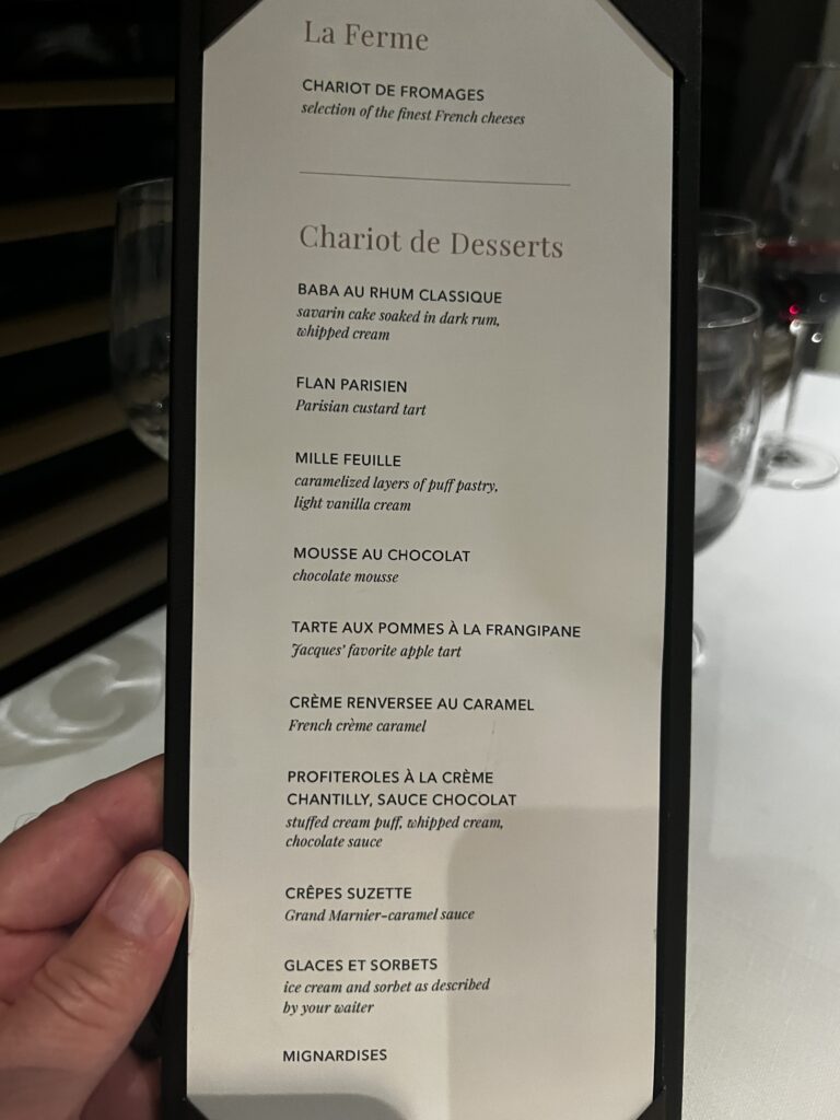 There are four specialty restaurants on The Vista: PoloGrill (steakhouse), Toscana (Italian), Jacques (French bistro), and Red Ginger (pan-Asian). All four are outstanding and as a World Cruiser we get 10 reservations at each restaurant over the 120-day cruise. We have made 28 of 40 reservations thus far and I’m not sure we can even make the 28 reservations. Here is the menu for Jacques. I apologize for the shadows. Any suggestions on how to deal with the shadows when taking photos, please pass along your suggestion or remedy.