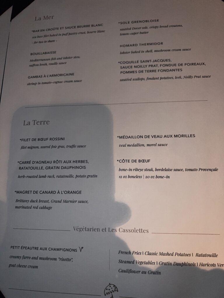Menu & Dining Experience: The menu focuses on traditional French favorites, including rotisserie meats, artisanal cheeses, and rich desserts, often with tableside preparation.