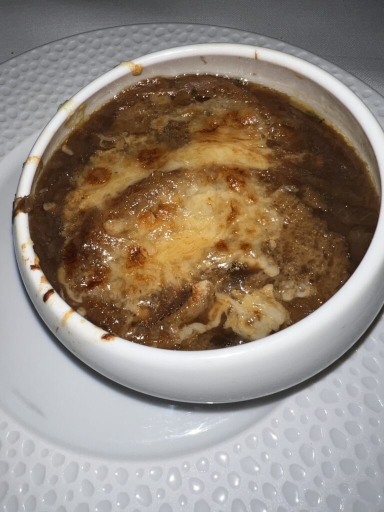 Jackie: Lump Crab Meat Salad, Onion Soup, Filet Mignon, Mashed Potatoes, Flan Parisien
