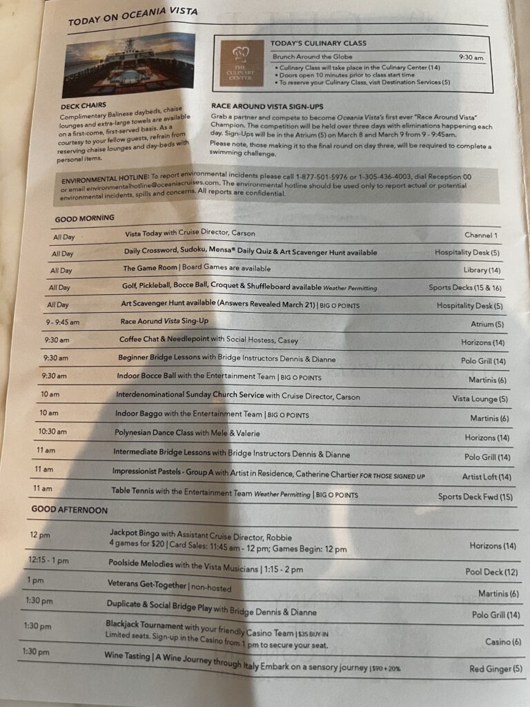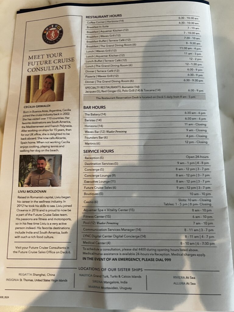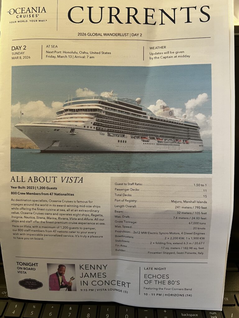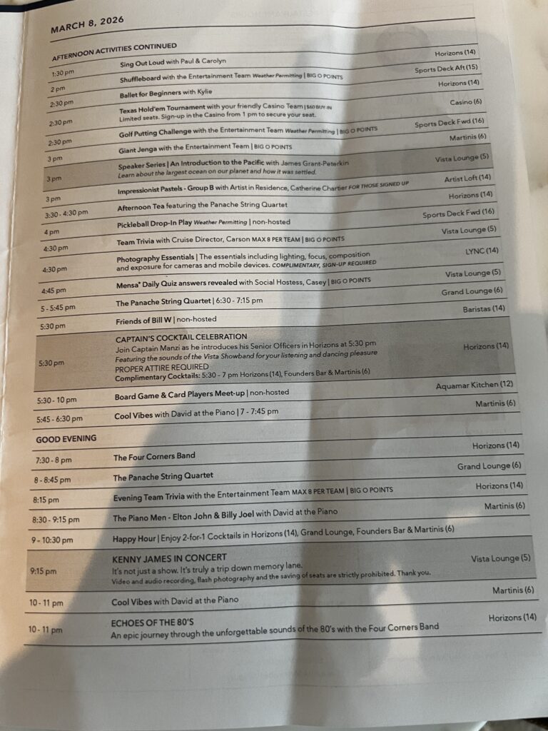 Sunday March 8th we woke up and had breakfast in the main dining room, then returned to the cabin to finish putting things away. I went to the IT department called Lync to see why I could not connect my laptop to the Wi-Fi. It was easily fixed. After a quick lunch at The Waves Grill, we finished up in the cabin. I went off to the Cigar Lounge to meet a fellow passenger David Chen who I connected with through the Facebook group for this cruise. I encourage you to follow along on this group page as some passengers have some great posts daily. 2026 Oceania Vista World Cruisers | Facebook