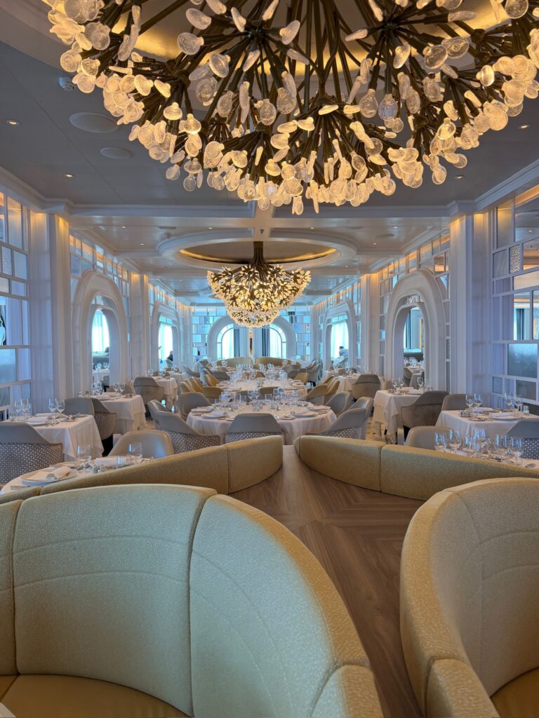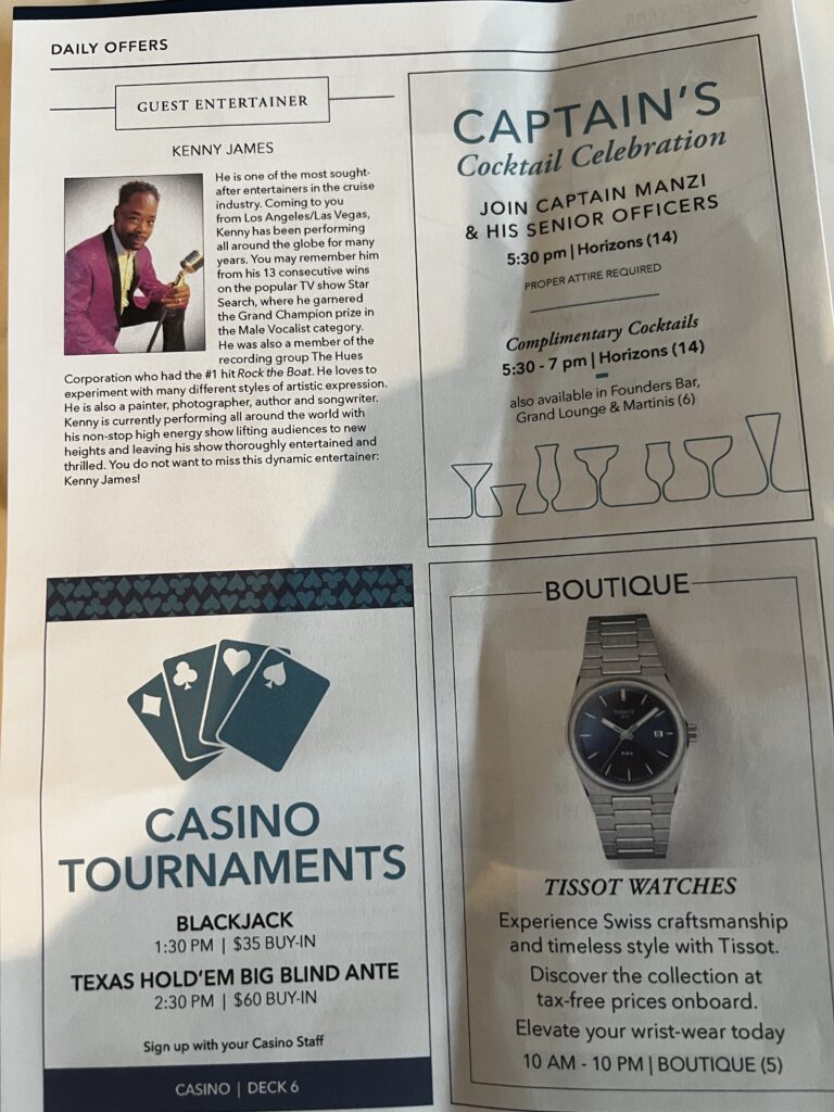 Last night was The Captain’s Cocktail Celebration. Hey, we surprised ourselves as we actually attended. Well, sort of because we went to the Martini Bar. After the cocktail hour was over,/ we went to the dining room but there was a long wait so we walked around, went back to the cabin to continue getting it in order and then went back for dinner. I need a reminder to take photos of the menu and meal. I will get better.